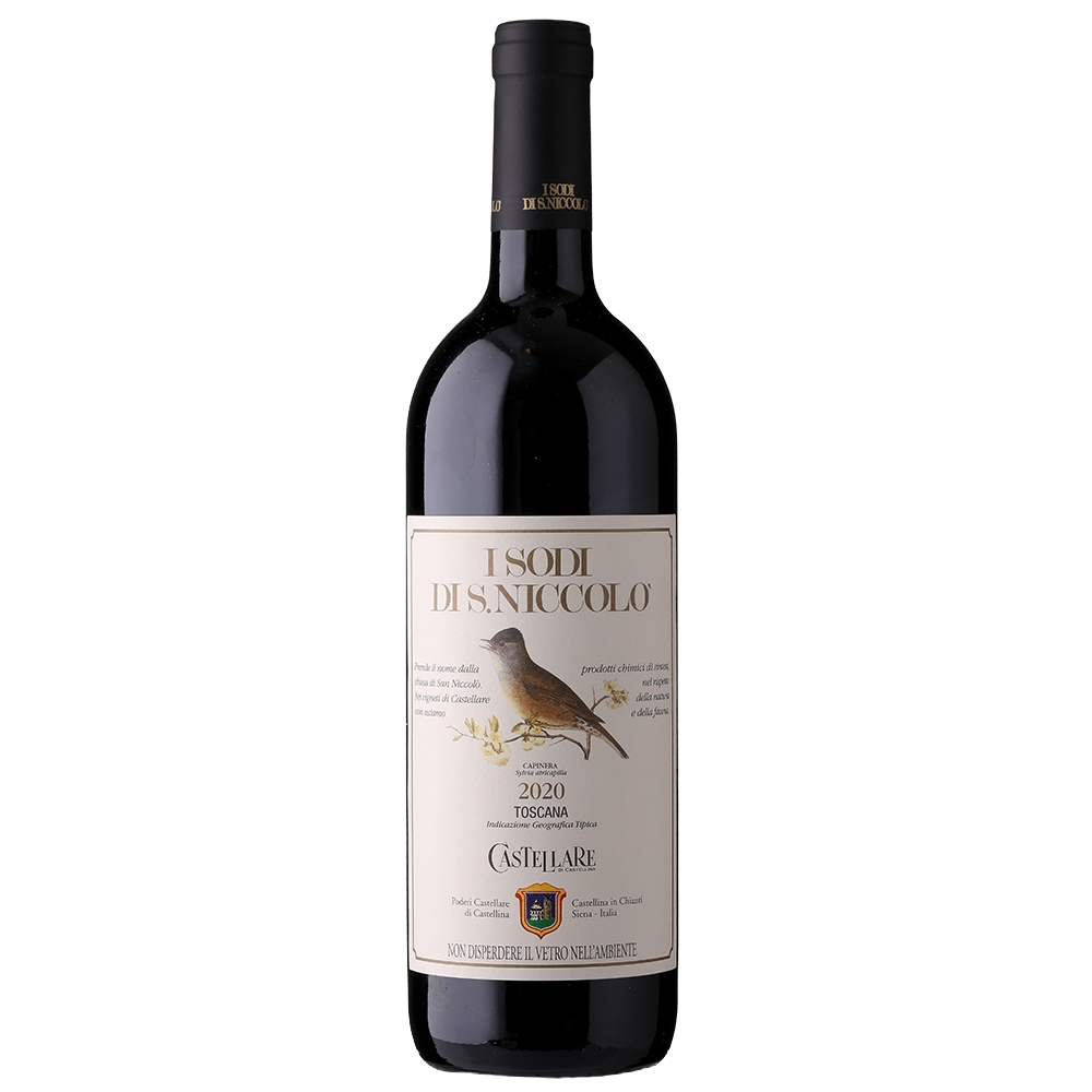 I Sodi di San Niccolò represents the Grand Cru of Castellare di Castellina, one of the first Supertuscans made exclusively with native vines: 85% Sangioveto and 15% Malvasia Nera. The name "Sodi" comes from the Tuscan term used to describe those lands that are difficult to work by hand due to their hardness or slope, while "San Niccolò" refers to the 14th century church located on the Castellare property, around which some of the most suitable vineyards are located. The label features the iconic bird, symbol of the company's commitment to sustainable viticulture, carried out for over 40 years.